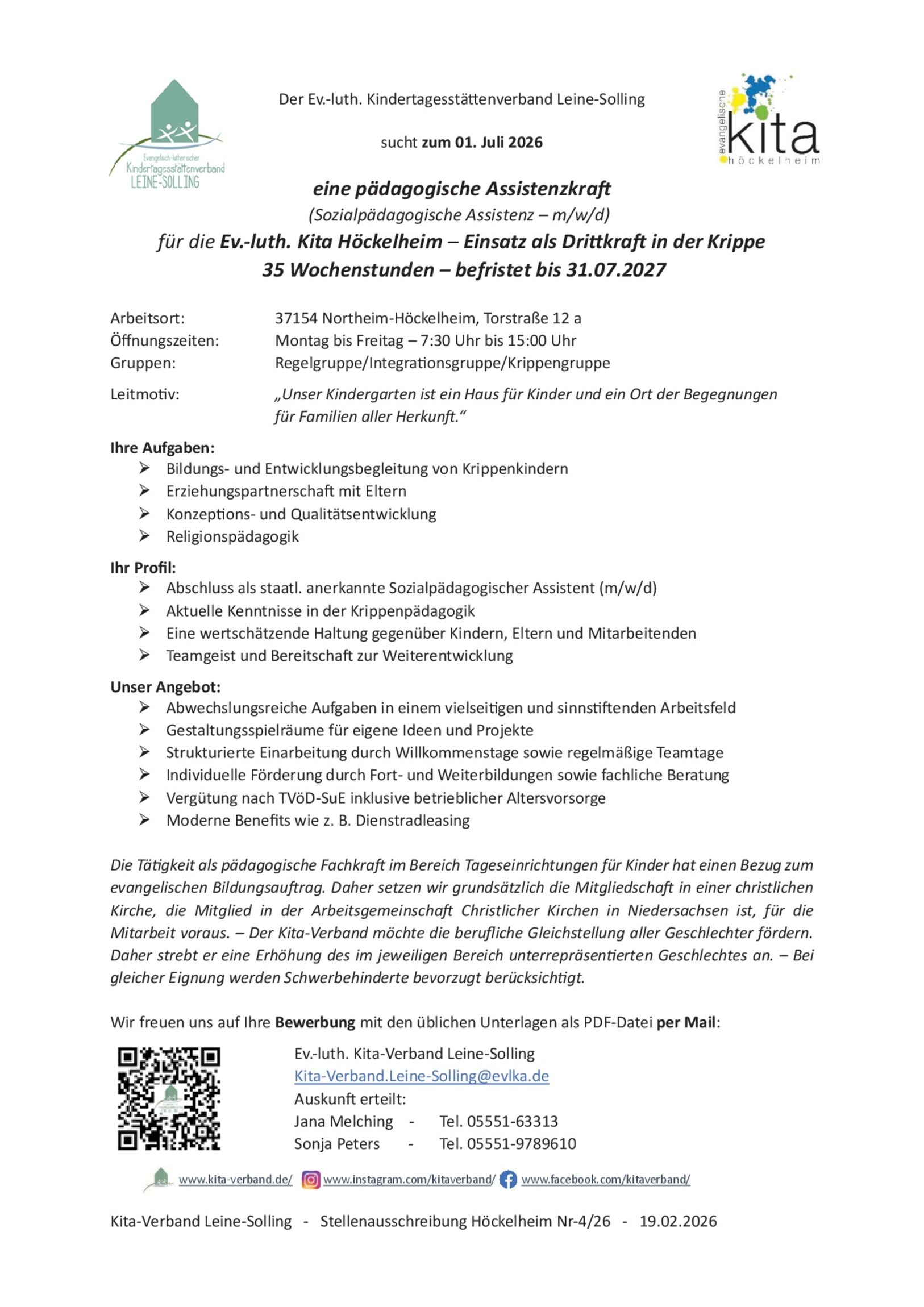 Stellenausschreibung pädagogische Assistenzkraft (Sozialpädagogische Assistenz – m/w/d) Kita Höckelheim Nr. 4/26
